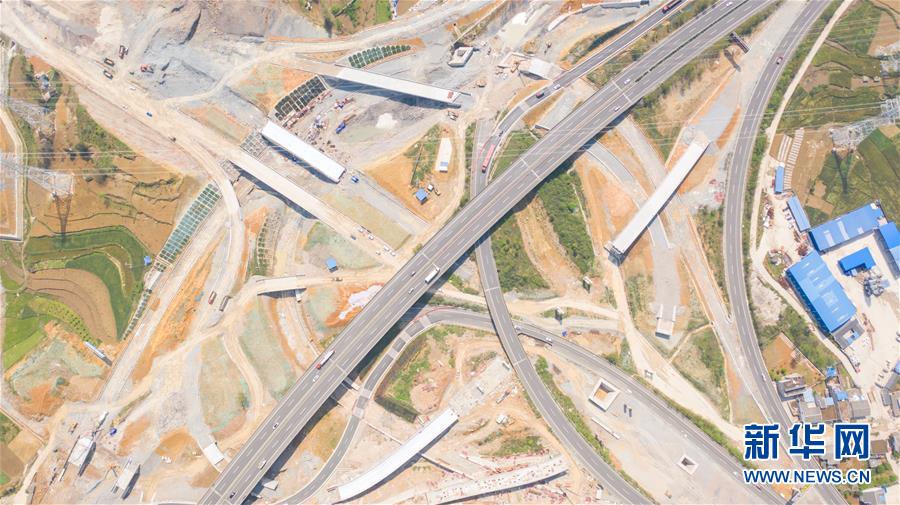 这是建设中的兴义环高磨盘山互通枢纽(3月25日摄,无人机照片)。 近日,由贵州公路集团承建的兴义市环城高速公路项目在做好疫情防控的同时,抓紧复产复工,目前工程复工率已达100%。 新华社记者 陶亮 摄