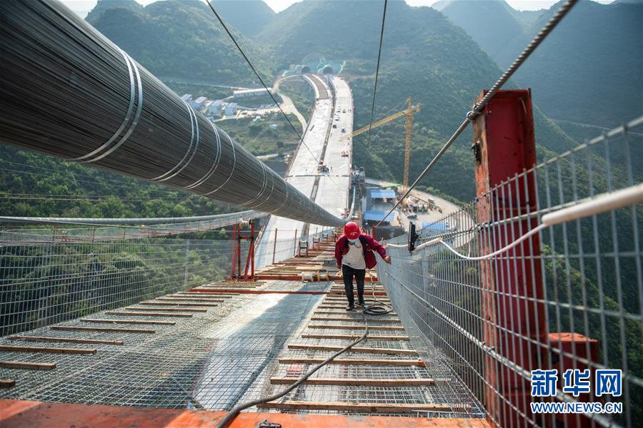 工人走向峰林特大桥主塔塔顶(3月25日摄)。 近日,由贵州公路集团承建的兴义市环城高速公路项目在做好疫情防控的同时,抓紧复产复工,目前工程复工率已达100%。 新华社记者 陶亮 摄
