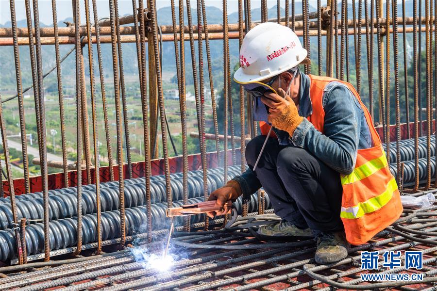 工人在兴义环高双山大桥建设工地施工(3月25日摄)。 近日,由贵州公路集团承建的兴义市环城高速公路项目在做好疫情防控的同时,抓紧复产复工,目前工程复工率已达100%。 新华社记者 陶亮 摄