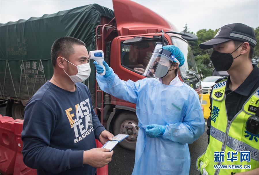 3月26日,在武汉北高速收费站交通卡点,工作人员对乘车人员进行测温。 近日,随着部分企业逐渐复产复工,由高速路进入武汉的务工、回家等返城人员陆续增多。在武汉各高速收费站交通卡点,执勤人员对过往乘客逐人查验湖北健康码“绿码”和身份证明等信息,确保来汉人员安全有序流动。 新华社记者 肖艺九 摄