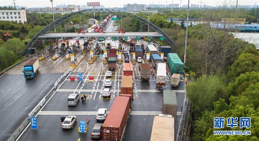 3月26日,在武汉北高速收费站交通卡点,返汉车辆排队等候入城(无人机照片)。 近日,随着部分企业逐渐复产复工,由高速路进入武汉的务工、回家等返城人员陆续增多。在武汉各高速收费站交通卡点,执勤人员对过往乘客逐人查验湖北健康码“绿码”和身份证明等信息,确保来汉人员安全有序流动。 新华社记者 肖艺九 摄