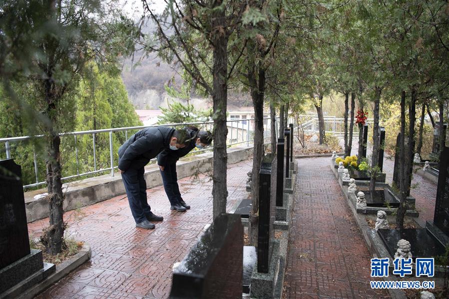 3月26日,在太原市仙居园公墓,提供代祭服务的工作人员在祭扫结束后鞠躬。新华社记者 杨晨光 摄