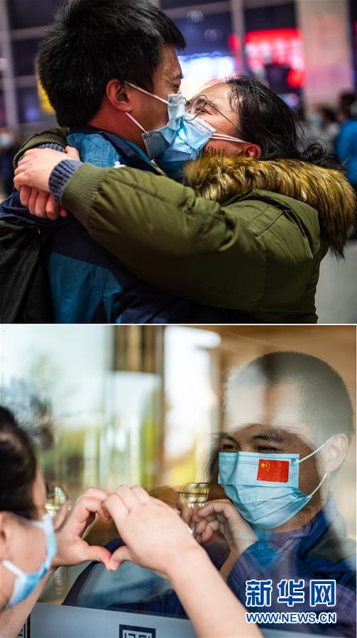 这是一张拼版照片:上图为贵州援鄂医疗队队员黄秀峰出发前在机场和妻子章婷吻别(2月11日摄);下图为贵州援鄂医疗队队员黄秀峰返回后和妻子章婷在隔离酒店门口隔着玻璃比心(3月26日摄)。