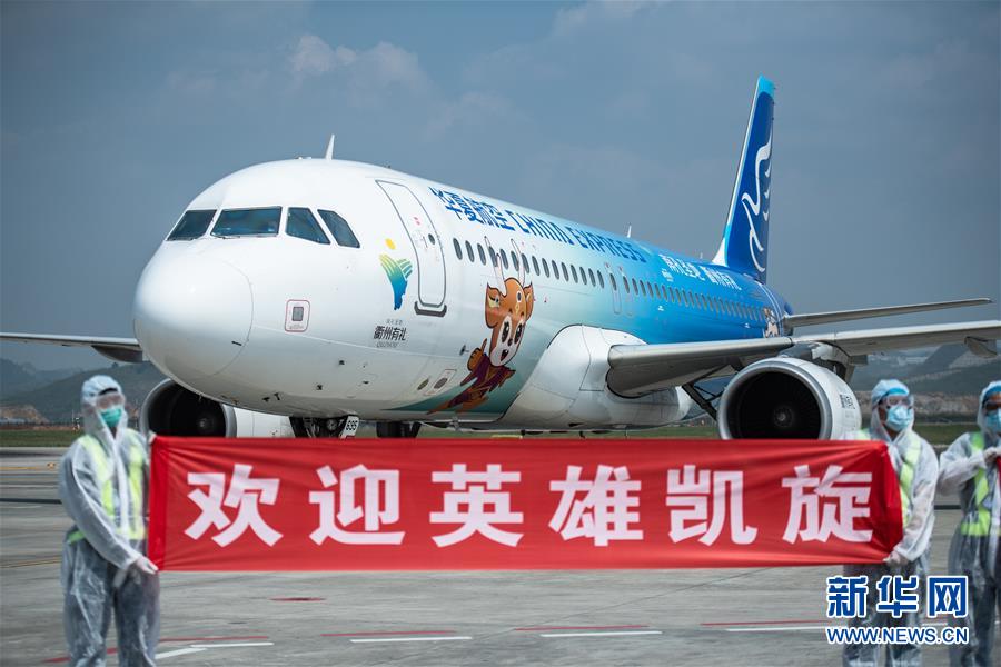 贵州援鄂医疗队队员乘坐的飞机抵达贵阳龙洞堡机场(3月26日摄)。新华社记者 陶亮 摄