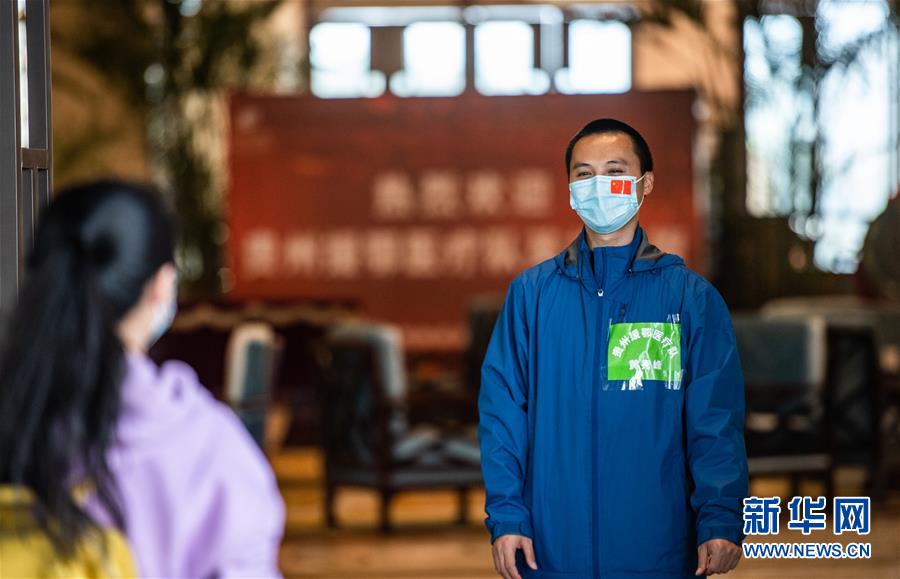 在隔离酒店里的贵州援鄂医疗队队员黄秀峰与酒店外的妻子章婷打招呼(3月26日摄)。新华社记者 陶亮 摄
