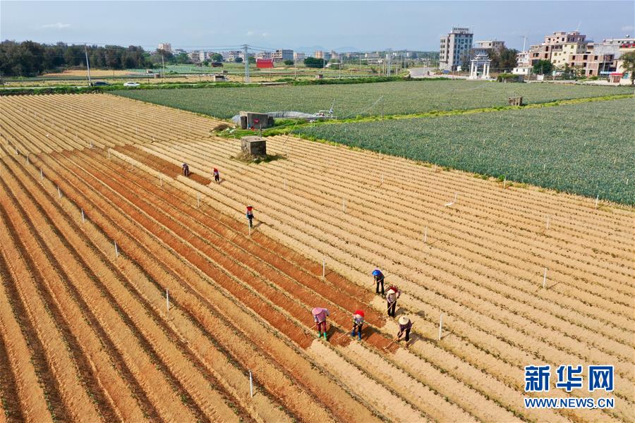 3月27日,漳浦县六鳌镇地瓜种植农户们在田间护理地瓜苗(无人机照片)。新华社记者 姜克红 摄