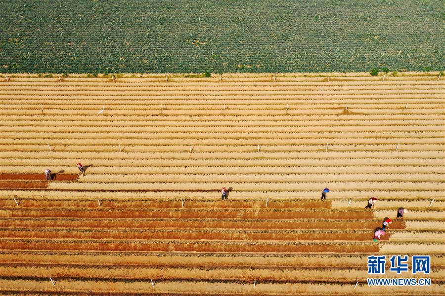 3月27日,漳浦县六鳌镇地瓜种植农户们在田间护理地瓜苗(无人机照片)。新华社记者 姜克红 摄