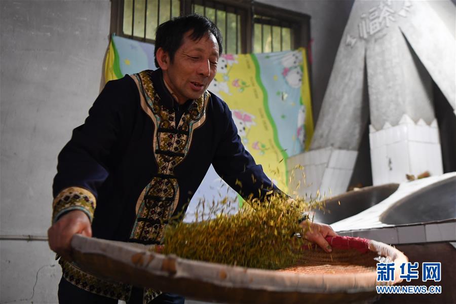 3月27日,湖南省湘西土家族苗族自治州古丈县阿七茶厂的制茶师在对杀青过的茶叶进行摊凉。 近日,随着气温升高,湖南省湘西土家族苗族自治州古丈县春茶开始采摘,制茶师将茶青制为当地特色的明前古丈毛尖茶。 新华社记者 薛宇舸 摄
