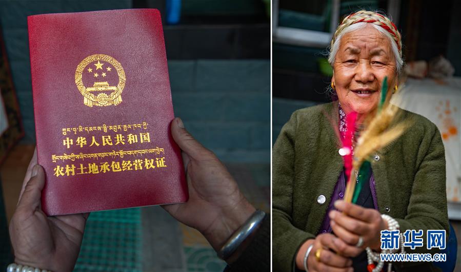 左图:巴杰展示自家农村土地承包经营权证;右图:巴杰在家中展示五彩青稞(拼版照片,3月13日摄)。新华社记者 普布扎西 摄