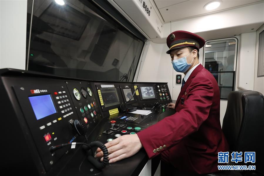 3月28日,武汉地铁2号线首班车司机张瑞在常青车辆段检查车辆,他将驾驶地铁2号线首班列车。 当日,武汉轨道交通部分线路恢复运营,各车站出入口仅部分开放。 新华社记者沈伯韩摄