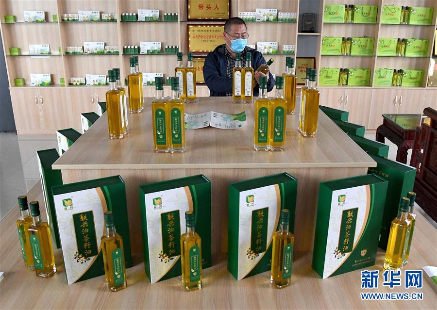 3月27日,参观者在河南省光山县一家油茶加工企业的展厅内了解产品。新华社记者 李安 摄