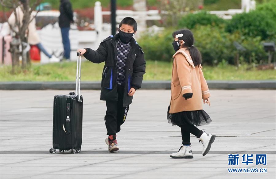 3月28日,两名抵汉的小旅客在武汉站广场上。 新华社记者 程敏 摄
