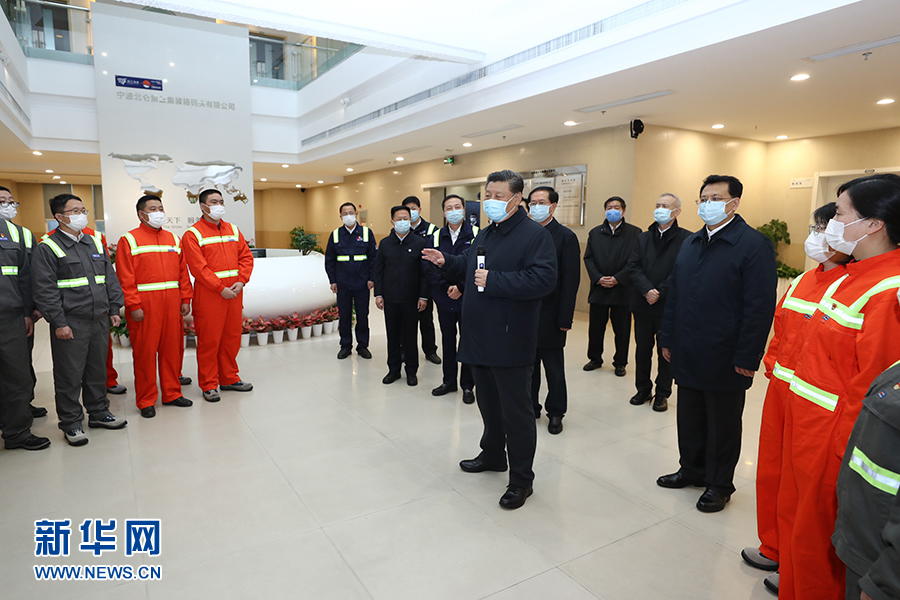 3月29日,中共中央总书记、国家主席、中央军委主席习近平在浙江考察调研。这是习近平在宁波舟山港穿山港区码头了解港口复工复产情况。 新华社记者 鞠鹏 摄