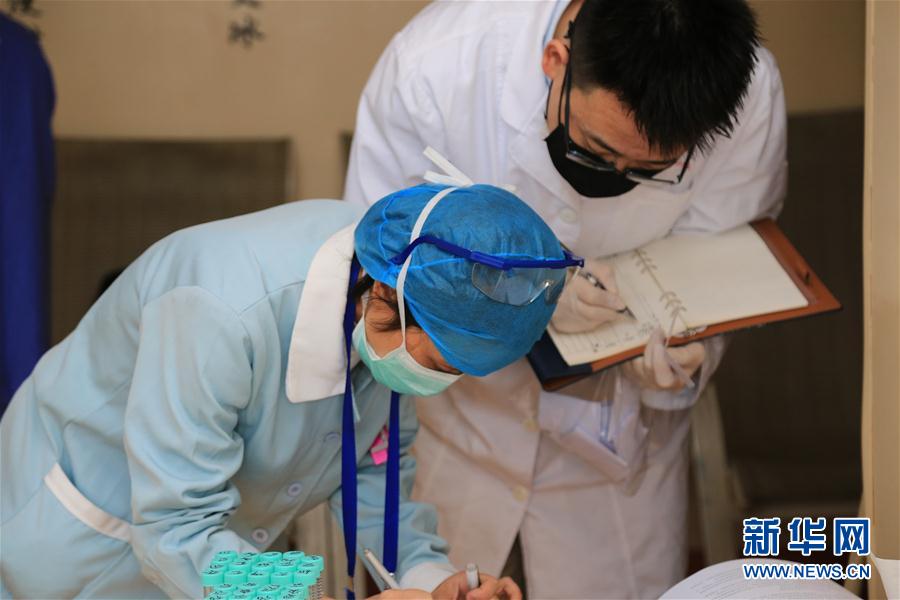 3月6日,在广州医科大学附属第一医院广州呼吸健康研究院,中科院沈阳自动化所研究员刘浩(右)在协调志愿者入组临床试验。 新华社发