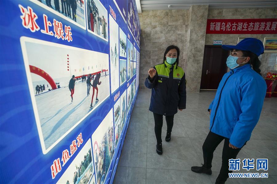 3月29日,来自墨玉县普恰克其乡阔勒艾热克村的布再乃普.阿卜来海提(右)在福海县海上魔鬼城景区了解用工岗位。新华社记者 赵戈 摄