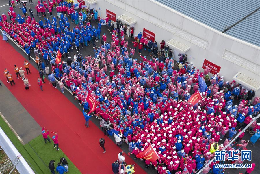 3月29日,医护人员参加在武汉雷神山医院举行的集中撤离仪式(无人机照片)。 当日,武汉雷神山医院举行首批外省医疗队集中撤离仪式,送别即将踏上归途的辽宁、上海、吉林、广东、山西、河北医疗队的1090名医护人员。 新华社记者 才扬 摄