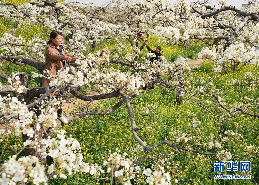 3月29日,赵县谢庄乡李志辉梨果种植专业合作社的社员在给梨花进行人工授粉。 近日,河北省赵县的梨树陆续开花,果农抢抓农时给梨树疏花授粉。 新华社记者 杨世尧 摄