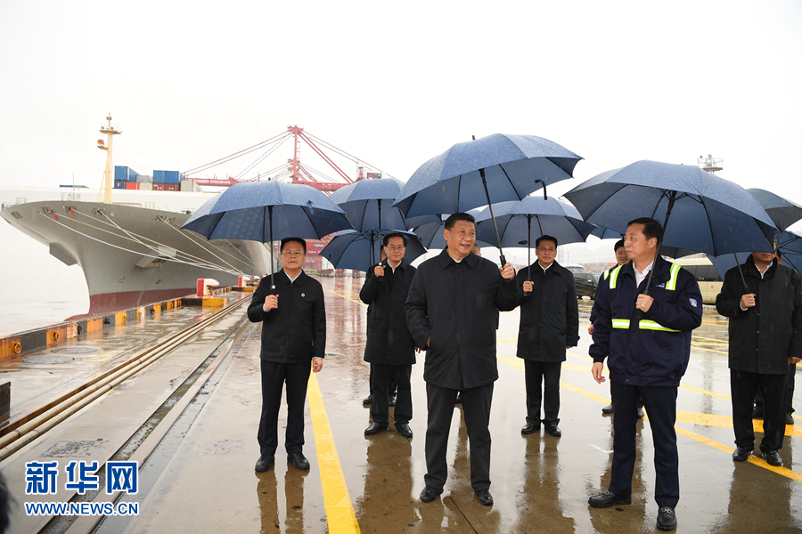 3月29日,中共中央总书记、国家主席、中央军委主席习近平在浙江考察调研。这是习近平在宁波舟山港穿山港区码头了解港口复工复产情况。 新华社记者 申宏 摄