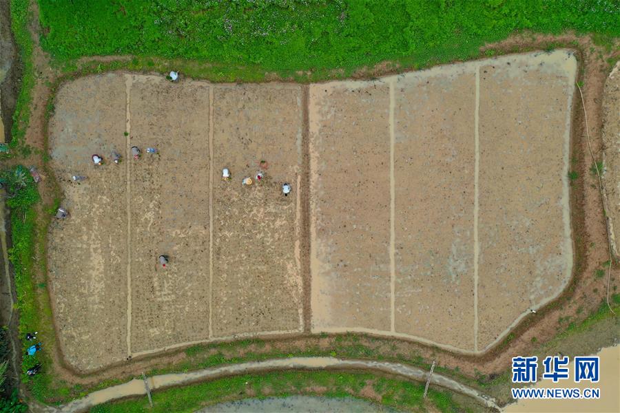3月30日,广州海珠湿地员工在稻田劳作(无人机照片)。新华社记者 刘大伟 摄