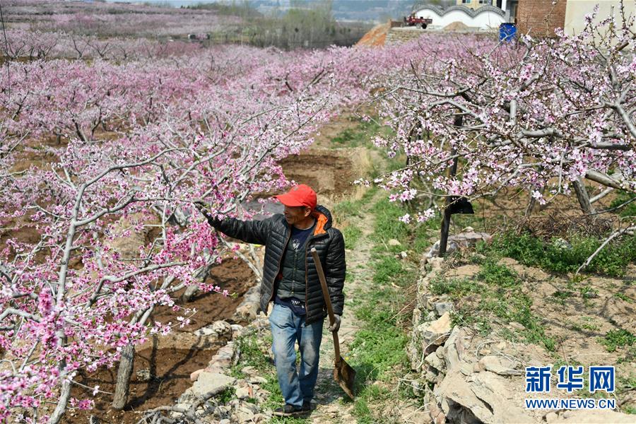 3月30日,济南市仲宫街道先锋店村村民张信忠查看桃树开花情况。 随着气温升高,位于山东省济南市仲宫街道的万亩桃园进入盛花期,漫山遍野的桃花将大地装扮得美不胜收。 新华社记者 朱峥 摄