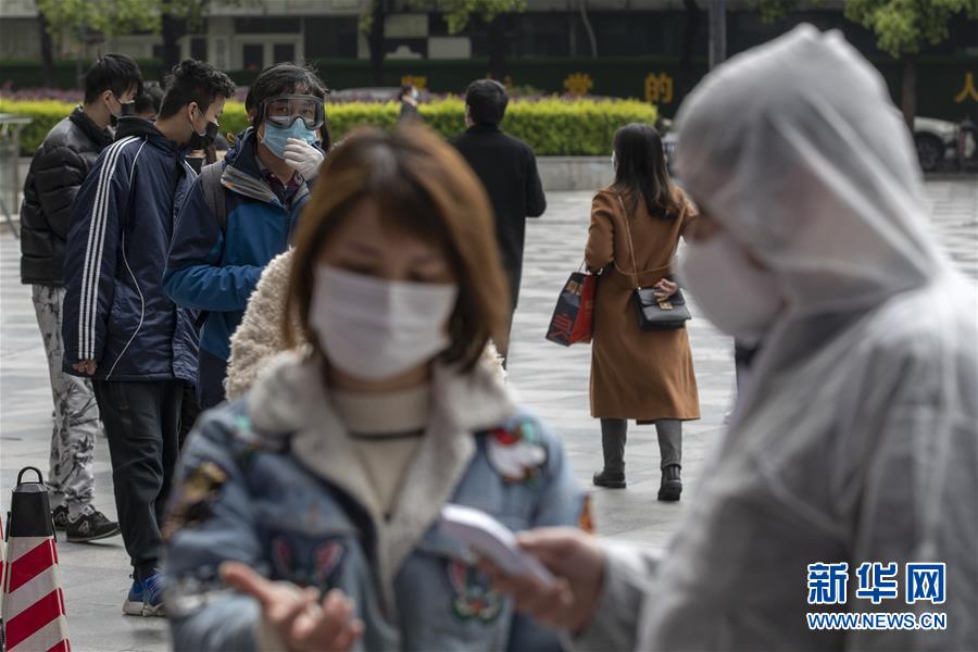 3月30日,在武商国际广场的超市门口,工作人员在测量顾客的体温。 当日,武汉市多家商场开门迎客。 新华社记者费茂华摄
