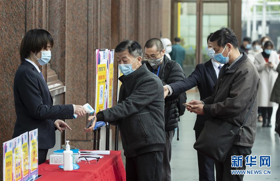 3月30日,在武商世贸广场,工作人员在为顾客测量体温。 当日,武汉市多家商场开门迎客。 新华社记者费茂华摄
