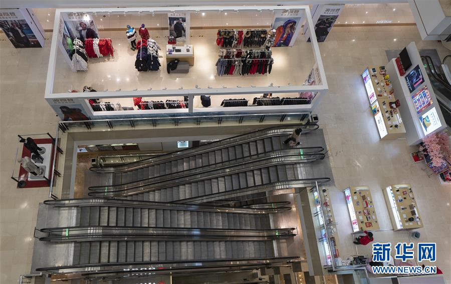 3月30日,在武商世贸广场,一位顾客乘坐滚梯。 当日,武汉市多家商场开门迎客。 新华社记者费茂华摄