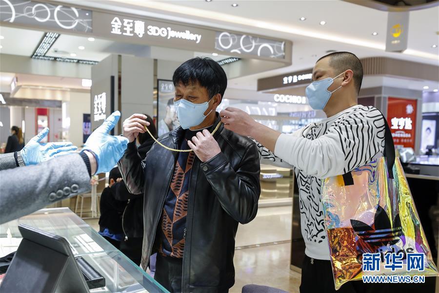 3月30日,在武汉市武商世贸广场,顾客(右二)在挑选饰品。 当日,武汉市多家商场开门迎客。 新华社记者 沈伯韩 摄