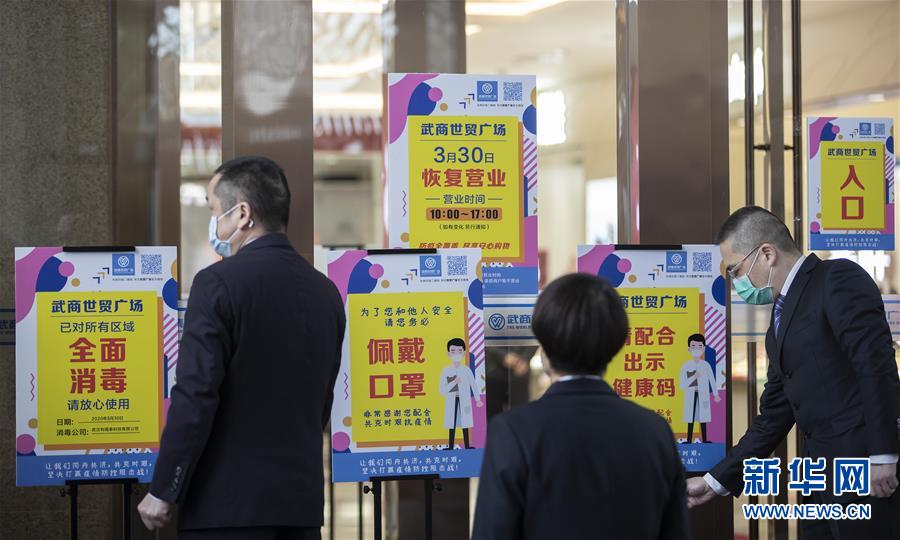 3月30日,在武商世贸广场,工作人员在开门前布置标志牌。 当日,武汉市多家商场开门迎客。 新华社记者费茂华摄