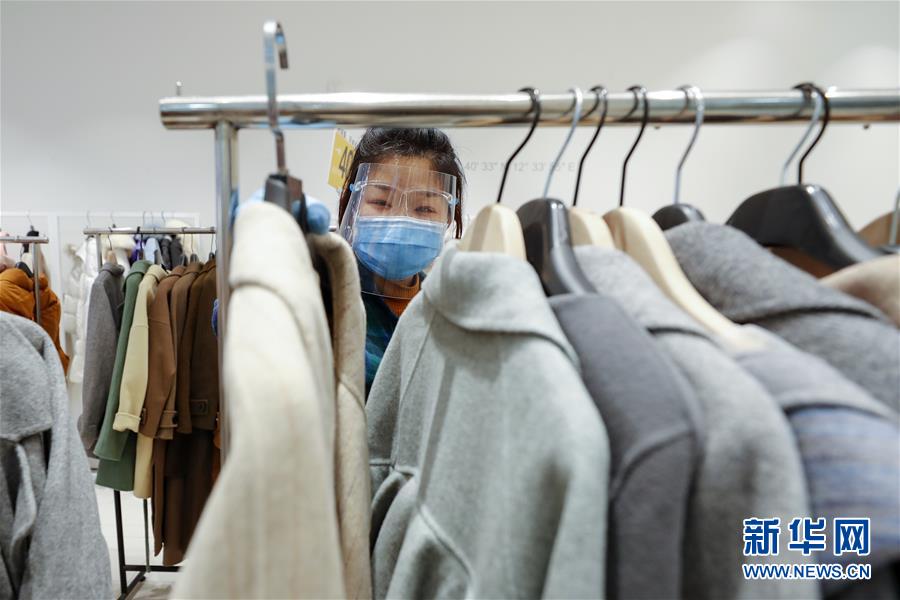 3月30日,在武汉市武商世贸广场,销售员在整理货架上的衣服。 当日,武汉市多家商场开门迎客。 新华社记者 沈伯韩 摄