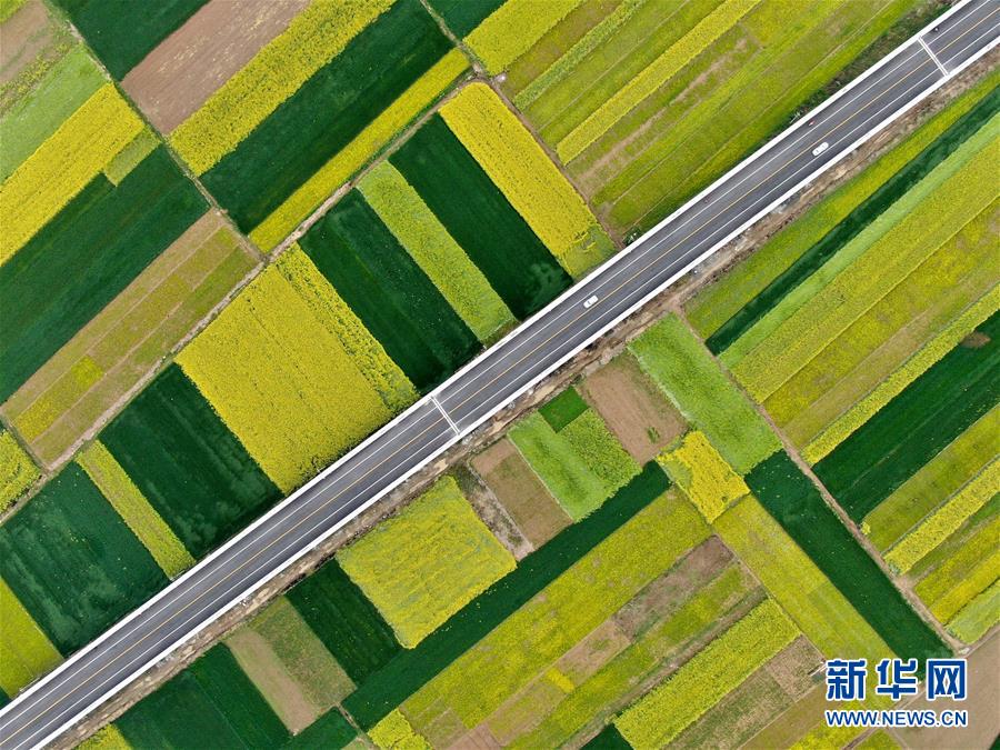 一座公路桥从河南省淮滨县毛庄村的田野中穿过(3月30日摄,无人机照片)。 近日,河南省淮滨县毛庄村淮河岸边的大片油菜花盛开,构成一幅生机勃勃的春日图景。 新华社记者 李安 摄