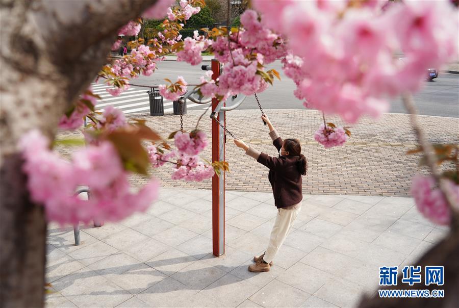 3月31日,市民在西安曲江新区一处广场上锻炼。 近日,陕西西安曲江新区一些广场和街道樱花盛开,成为市民健身休闲的好去处。 新华社记者 邵瑞 摄