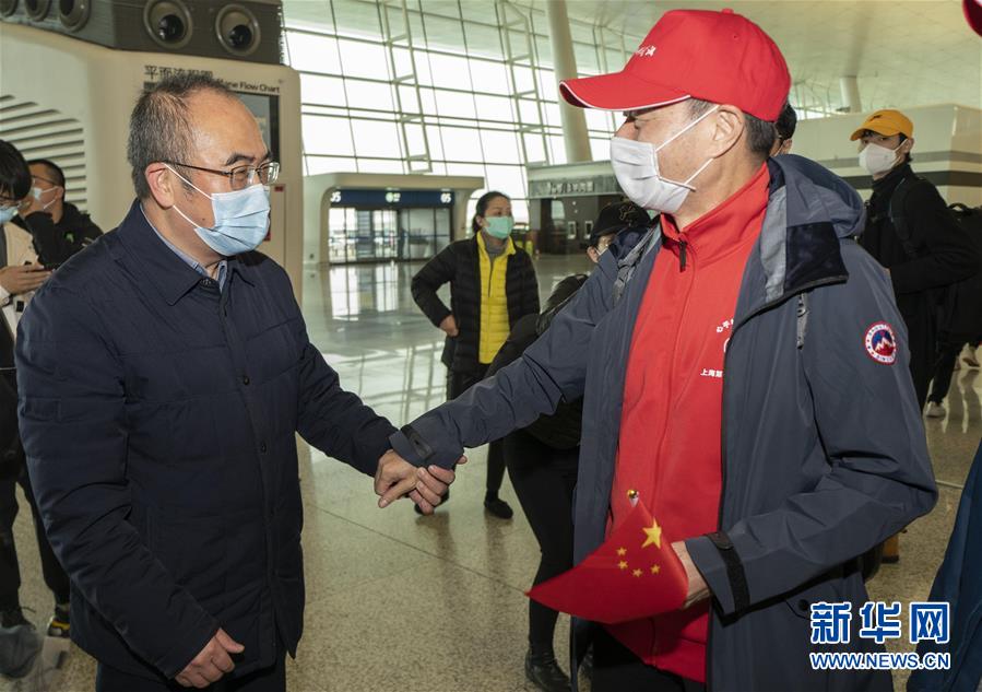 3月31日,武汉市金银潭医院院长张定宇(前左)在天河机场送别上海医疗队。 当日,多支援鄂医疗队踏上归程,近7000名医疗队队员从天河机场乘坐飞机离开武汉。 新华社记者 费茂华 摄