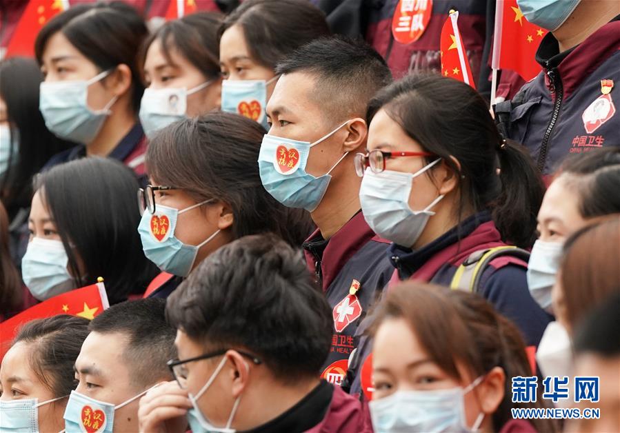 3月31日,四川援鄂医疗队三队队员们在撤离前合影。 当日,多支援鄂医疗队踏上归程,近7000名医疗队队员从天河机场乘坐飞机离开武汉。 新华社记者 程敏 摄