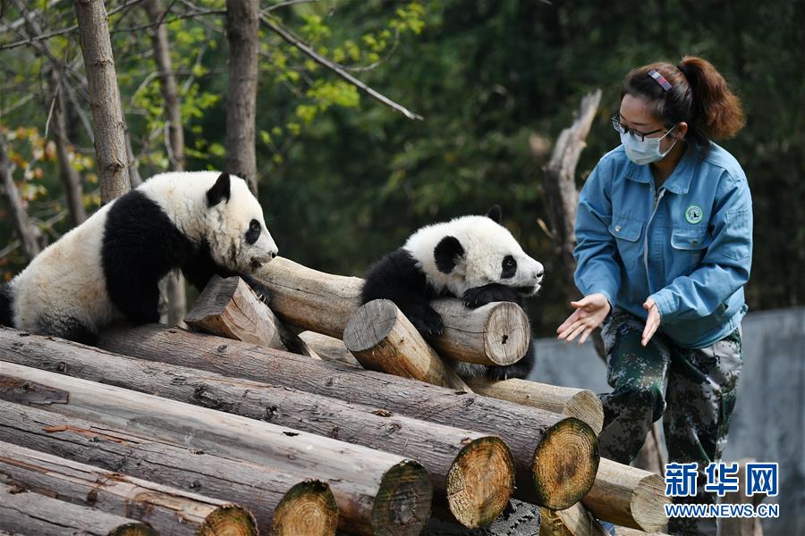 3月31日,在陕西省林业科学院秦岭大熊猫繁育研究中心,工作人员与大熊猫互动。 2019年,三只大熊猫幼崽“佳佳”“园园”“秦酷儿”在陕西省林业科学院秦岭大熊猫繁育研究中心出生,在工作人员的悉心照料下,三只大熊猫宝宝健康成长。 新华社记者 张博文 摄