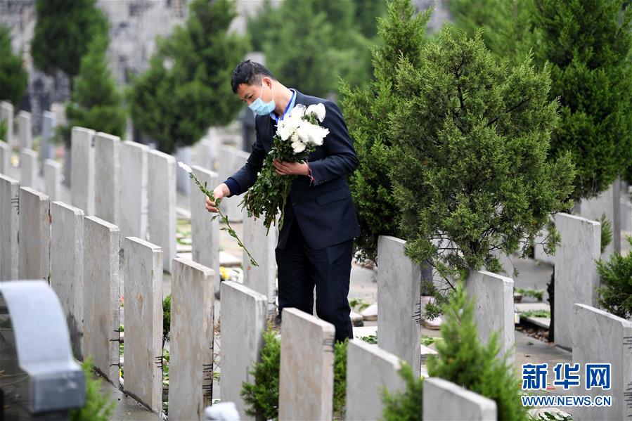 4月1日,在肥西县上派镇公益性公墓,提供代祭服务的工作人员在敬献鲜花。 清明将至,安徽省肥西县上派镇各公墓通过开展免费鲜花代祭服务,保障居民在新冠肺炎疫情期间的祭扫需求。 新华社记者刘军喜摄