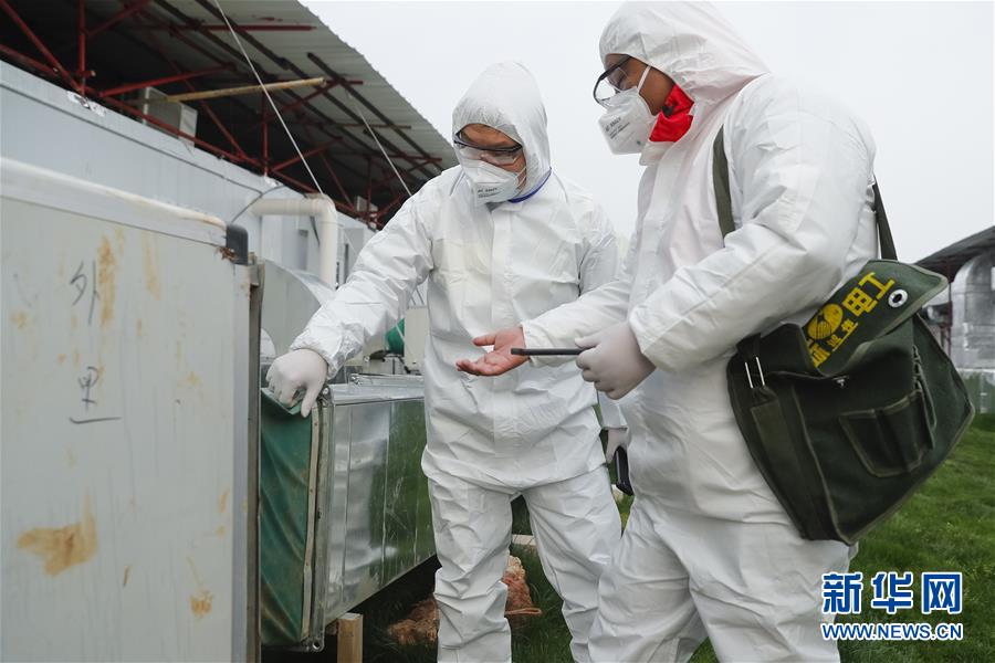 3月31日,尹典(左)和同事张健在武汉火神山医院检查连接重症病房的排风管的密闭情况。据尹典介绍,如果这类排风管出现故障,将导致从火神山医院负压病房里抽出的含有高浓度病毒的空气直接扩散到医院院区,造成大面积空气污染。因此,保障这类排风管的密闭、正常运转是火神山医院维修保养人员的重要工作之一。 新华社记者 沈伯韩 摄