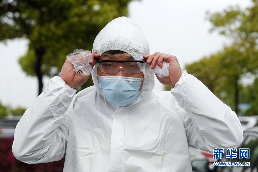 3月31日,尹典在武汉火神山医院外佩戴进入该院工作时所需的护目镜。 新华社记者 沈伯韩 摄