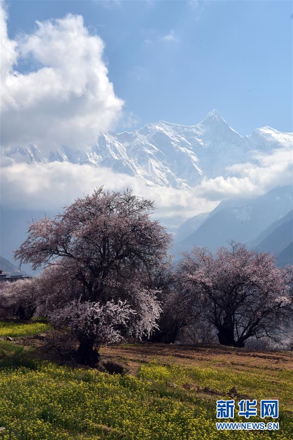 南迦巴瓦峰下盛开的桃花(4月1日摄)。 春天到来,雅鲁藏布江大峡谷中的桃花次第开放,将河谷两岸装点得如诗如画。 新华社记者 黄豁 摄