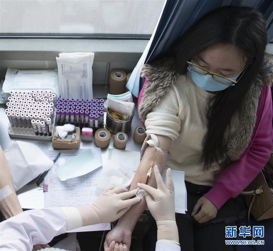 4月1日,在位于哈尔滨市南岗区花园街的黑龙江省粮食局办公地,志愿者在献血。新华社发(张涛 摄)