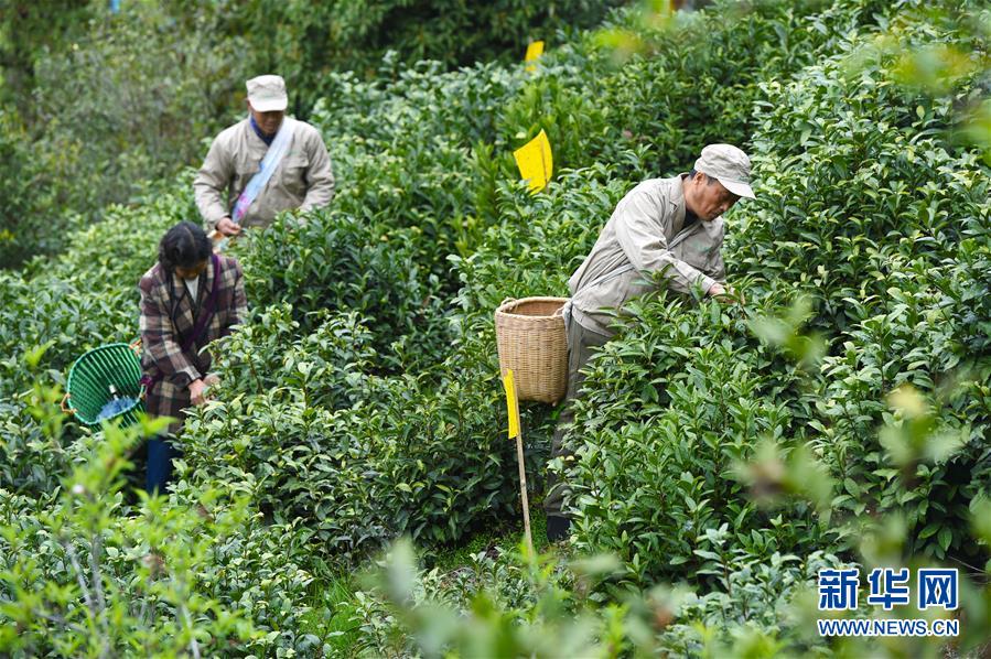 4月1日,茶农在黄山市富溪乡的茶园中采茶。 安徽省黄山市富溪乡是中国名茶黄山毛峰的核心产区。当地为增加贫困户家庭收入,积极探索、鼓励茶叶专业合作社参与支持扶贫工作。合作社将贫困户的鲜叶高于市场收购价10%予以收购,共惠及贫困户215户,户均年收入增收1200元。 新华社发 (周牧 摄)