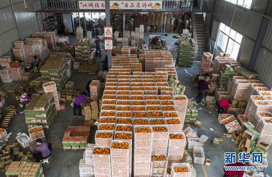 4月1日,秭归县屈橙鲜电商有限公司工人在包装车间包装脐橙(无人机照片)。 近日,湖北省宜昌市秭归县的电商企业在做好疫情防控的前提下,全部复工复产。电商企业加速与国内大型电商平台对接,销售当地农产品,助力村民脱贫增收。 新华社发(郑家裕 摄)