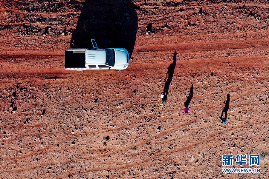 4月1日,在策耿家附近的戈壁上,策耿上完网课后准备上车回家。 新华社记者 刘磊 摄