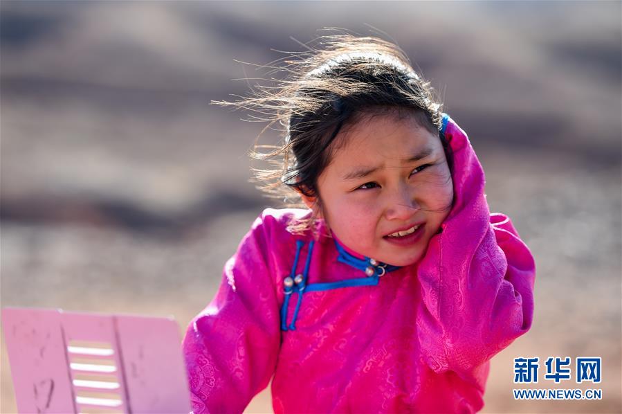 4月1日,由于山上风大温度低,策耿上课时捂住了耳朵。 新华社记者 连振 摄