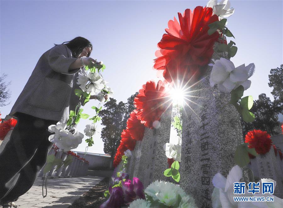 4月2日,河北唐山遵化市甲山革命烈士陵园工作人员替群众向革命烈士献花。