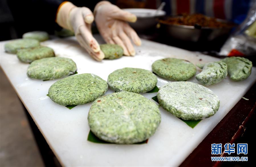 清明将至,安徽省黄山市徽州区的农家忙着制作清明粿。清明粿是当地清明时节的特色小吃,将新鲜艾草汁拌入糯米粉,再填入徽州特色风味的火腿肉、笋丁、肉丝萝卜丁等原料做成的馅,捏合成清明粿,蒸熟即可食用。 新华社发(周牧摄)