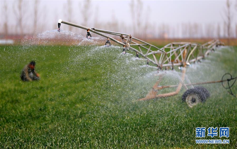 4月2日,在山东青岛市即墨区段泊岚镇刘家营里村,青岛馨健乐农机合作社的农民使用卷盘式喷灌机进行冬小麦灌溉。 新华社发(梁孝鹏 摄)