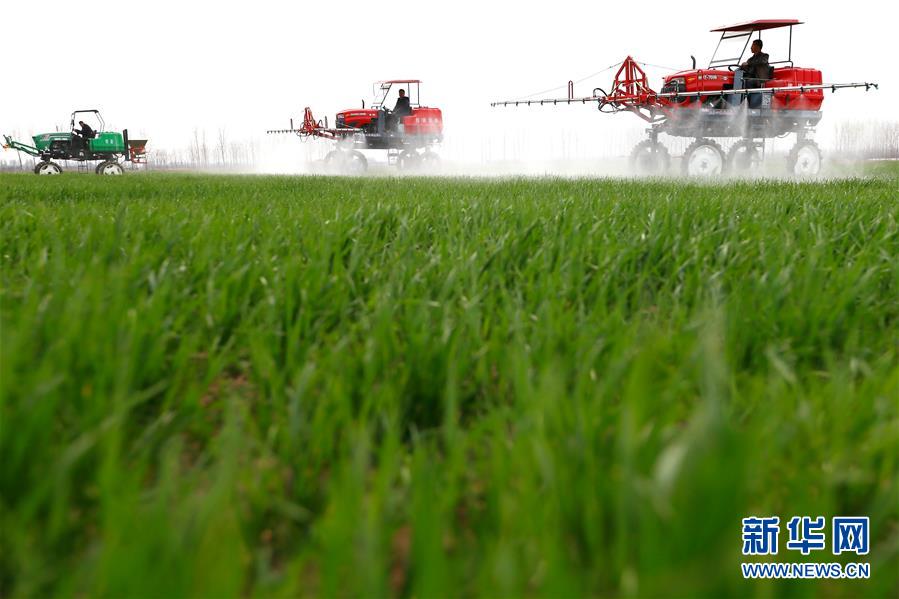4月2日,在山东青岛市即墨区段泊岚镇毛家岭四村,农民使用自走式高杆喷雾机在麦田里作业。 新华社发(梁孝鹏 摄)