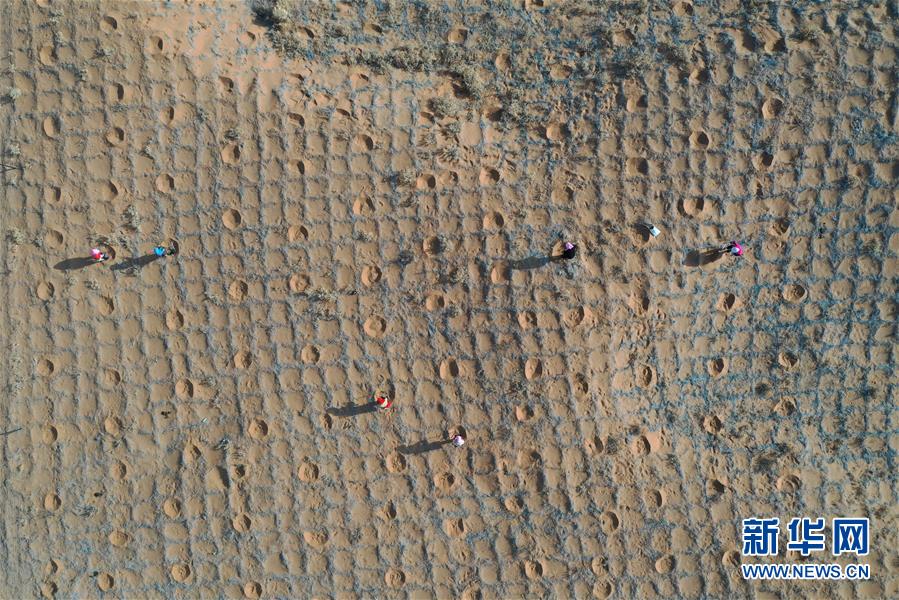 4月2日,在阿拉善左旗的腾格里沙漠中,工人在种植花棒(无人机照片)。 近日,在内蒙古自治区阿拉善左旗腾格里沙漠,工人们开始治沙、种植沙生植物。腾格里沙漠是我国第四大沙漠,此次治沙是中国绿化基金会百万森林计划——腾格里沙漠锁边生态公益项目,目的是通过种植生态锁边林阻止沙漠扩展蔓延。 新华社记者 刘磊 摄