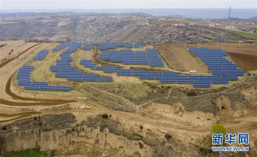 这是宁夏固原市彭阳县红河镇夏塬村里旱塬梯田上的光伏电站(无人机照片,4月2日拍摄)。新华社记者 杨植森 摄